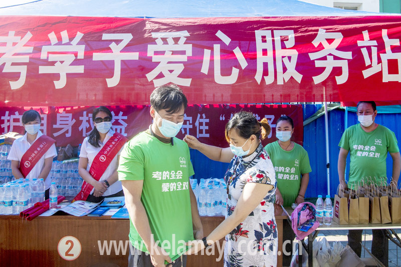 ????在第六中學(xué)考點門口,有一輛車鏡上系著綠絲帶的車輛,這是克拉瑪依綠絲帶志愿者協(xié)會為考生提供免費送考服務(wù)的“暖心送考車”。