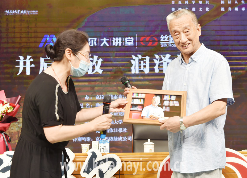 ????講座臨近尾聲,克拉瑪依市第一小學(xué)副校長余磊來到現(xiàn)場。她通過《克拉瑪依日?qǐng)?bào)》的報(bào)道,了解到主講人于健教授的母親馬香亭是克拉瑪依市第一小學(xué)的籌建人之一,借此機(jī)會(huì),她為于健教授送上了一份特別禮物——由專人拍攝、洗印、配以精美相框的于健教授的個(gè)人照片。