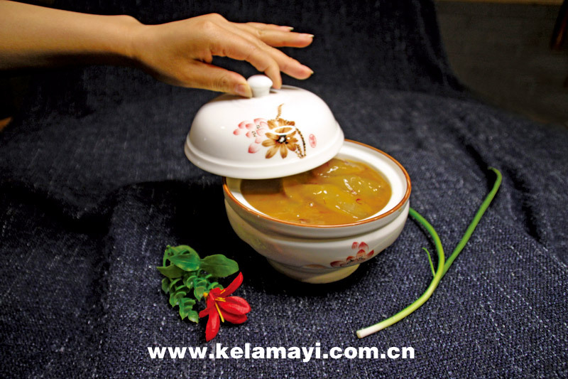 ????最后,服務(wù)員用精致的餐具器皿盛裝美味,在陶瓷盅中點(diǎn)上小火,確保恒溫。