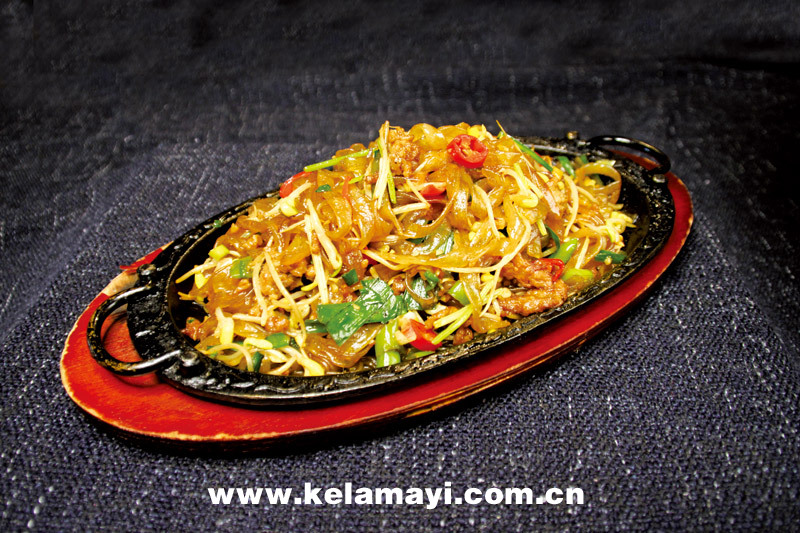 ????純手工制作的韭葉寬的紅薯粉。烹制前,先用冷水浸泡4小時以上,使粉條本身柔潤嫩滑,同時,配選阿勒泰地區(qū)黃牛后腿肉,將肥瘦相間的部位切成肉末,小火炒香,將二者完美地組合在一起。