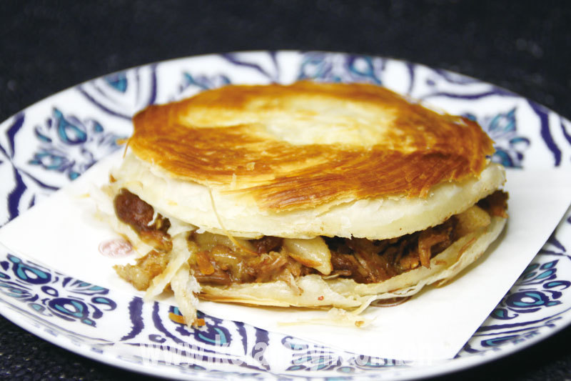 ????據(jù)制作酥皮掉渣肉夾饃的廚師潘新剛介紹,酥皮掉渣肉夾饃因其鮮香酥脆的口感而聞名,制作這道美味,對面餅的要求非常高?!霸诎l(fā)面過程中,面與水的配比要很講究,同時還要放入一定比例的堿,使面不再發(fā)酸;接著,再將醒好后的面揉成面團,達到軟硬適中的程度后,以110克作為稱重標準,將其揉成面團進行分份?!迸诵聞傉f。