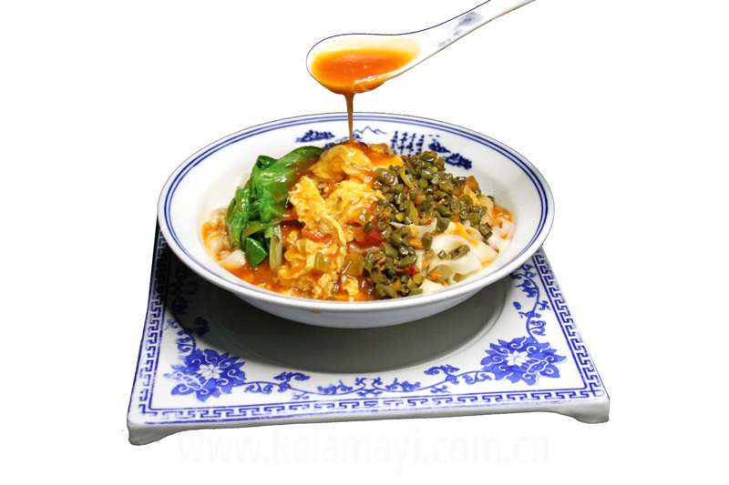 ????“西紅柿雞蛋臊子需選用新鮮西紅柿加入雞湯熬醬1小時(shí),同時(shí)加入柴雞蛋保障營養(yǎng)價(jià)值,最后搭配腌制好的酸豇豆、蔥花、青菜葉,才能色澤鮮艷,口感香脆?!蓖醮髽湔f,“麻辣牛肉刀削面則選用陜西漢中的辣椒,手工磨成粉后,利用上等的菜籽油熬制成辣椒醬,再加上粒大飽滿的牛腩粒炒香,加入雞湯小火熬制,口感鮮嫩有嚼勁?!?/p>