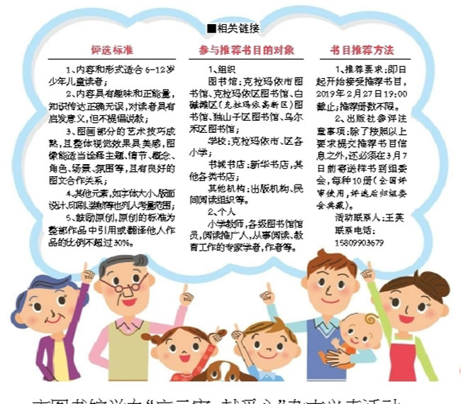 ????我市于今年加盟該項(xiàng)活動(dòng),活動(dòng)由市圖書(shū)館牽頭,市新華書(shū)店、我市各小學(xué)、克區(qū)圖書(shū)館、白堿灘區(qū)(克拉瑪依高新區(qū))圖書(shū)館、獨(dú)山子區(qū)圖書(shū)館、烏爾禾區(qū)圖書(shū)館共同參與。
