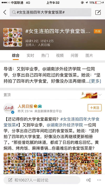 ????6月1日,這些照片就被湖南涉外經(jīng)濟(jì)學(xué)院的官微選中。6月3日,“女生連拍四年大學(xué)食堂飯菜”這一話(huà)題登上新浪微博熱搜榜前十名,并一路走紅至多家網(wǎng)絡(luò)媒體。短短幾天時(shí)間,人民網(wǎng)、人民日?qǐng)?bào)、新京報(bào)等官微相繼轉(zhuǎn)發(fā),有關(guān)此條微博的內(nèi)容累計(jì)被轉(zhuǎn)載評(píng)贊超過(guò)10萬(wàn)人次。